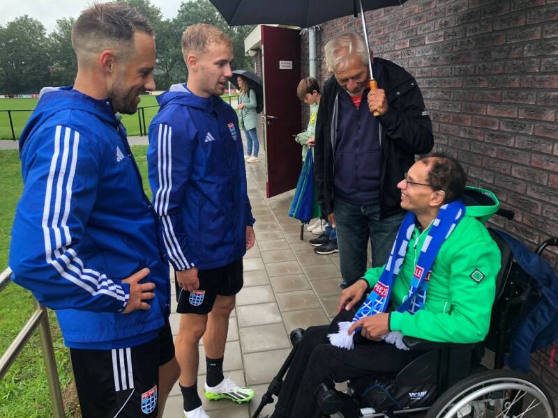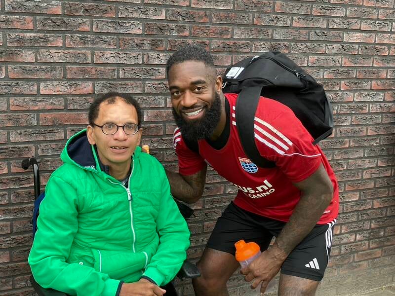 Heeft de vader van een lieve huisgenote van Tiago geregeld dat Tiago bij een training van de PEC spelers mocht komen kijken. Ook al regende het weer pijpenstelen, Tiago wilde het dolgraag meemaken. Zijn nieuwe favoriete club, hij kent de spelers bijna allemaal en zij hebben nu ook Tiago leren kennen. Want ze kwamen allemaal even bij hem en gingen spontaan met hem op de foto.